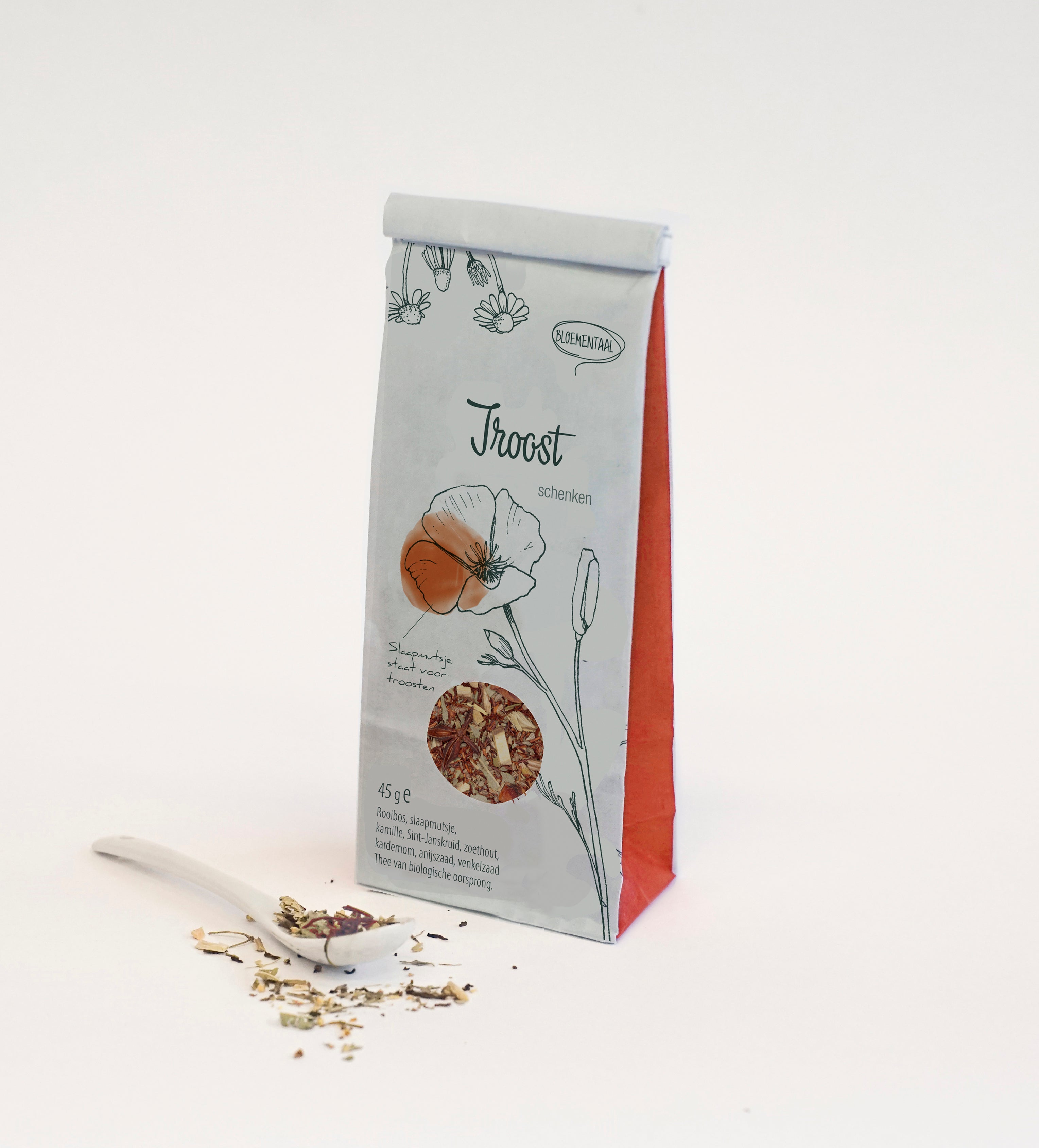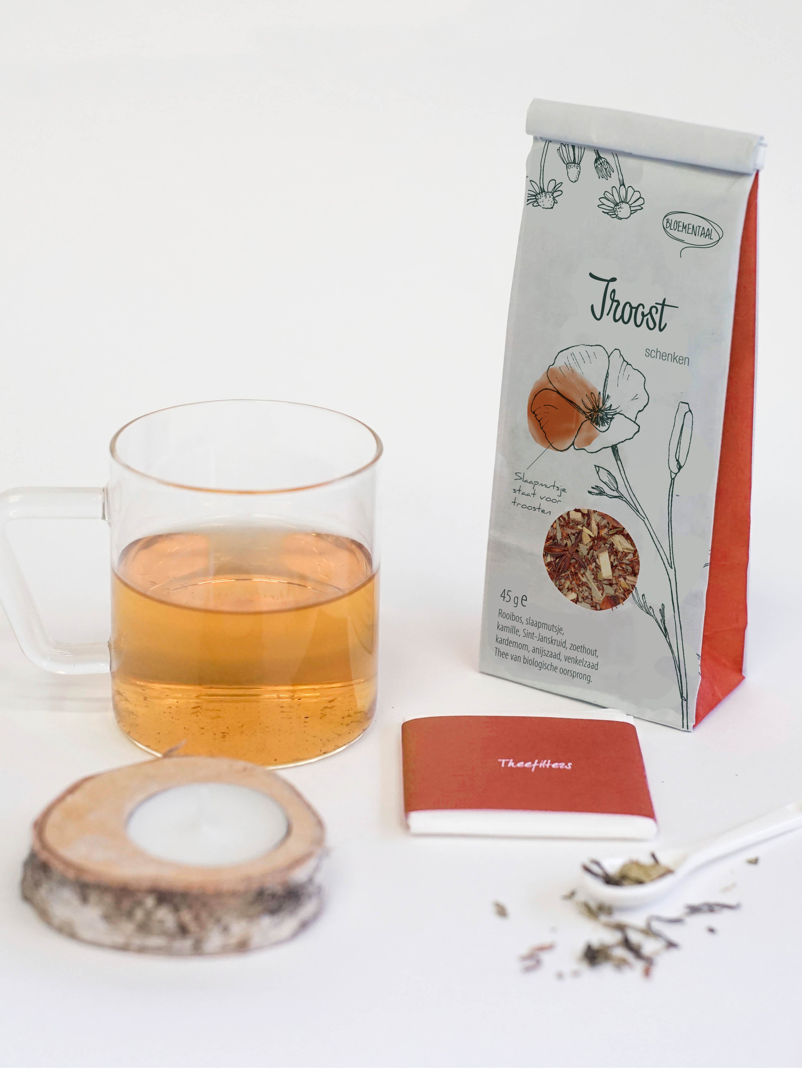 Rooibos thee van biologische oorsprong met slaapmutsje, kamille, Sint-Janskruid, zoethout, kardemom, anijszaad en venkelzaad. Slaapmutsje staat voor troosten. Lees meer